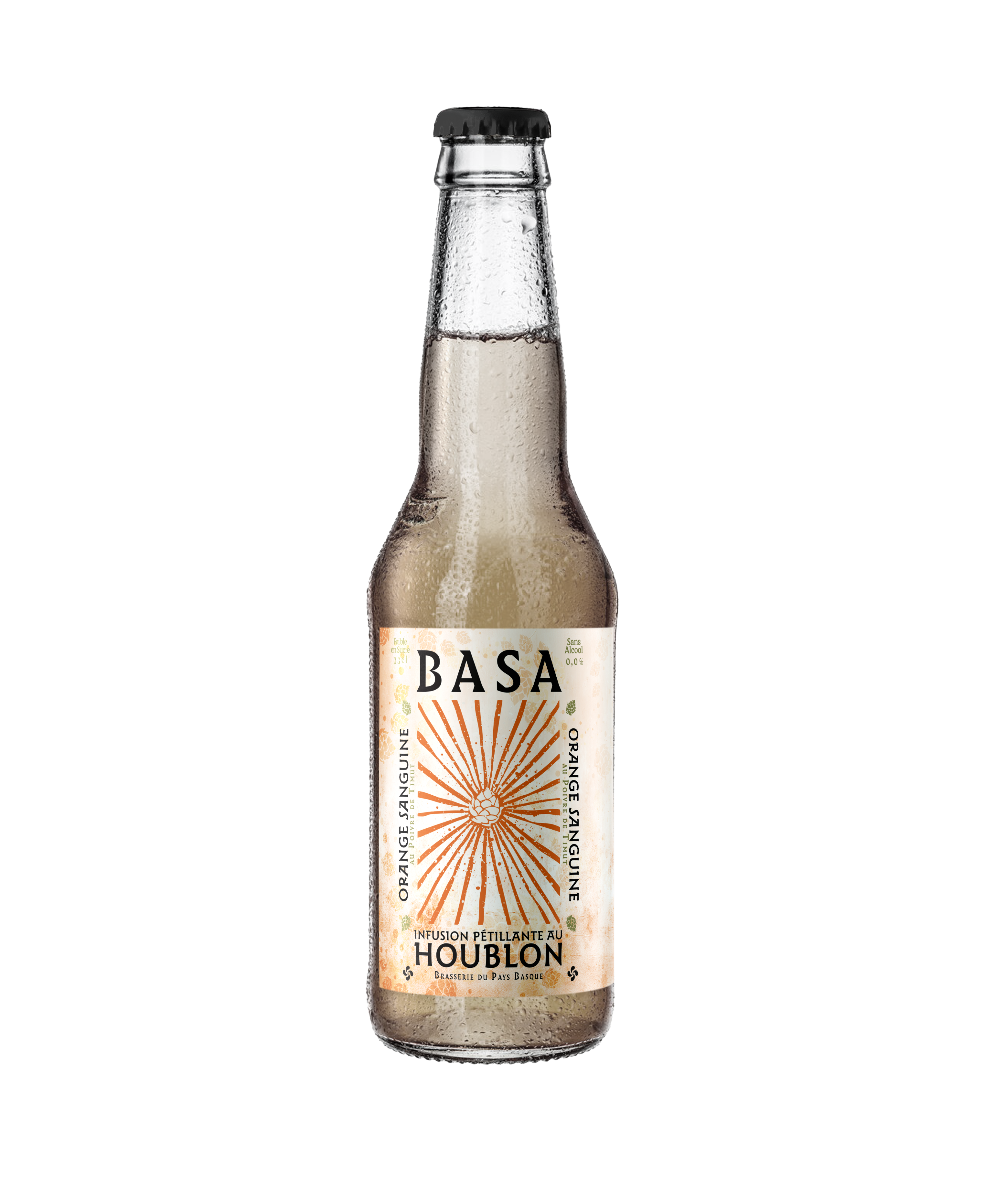 BASA Orange Sanguine & Poivre de Timut est une boisson pétillante, sans alcool et faible en sucre, issue d’une infusion de houblon Citra. L’orange sanguine offre une belle rondeur fruitée, avec des notes légèrement sucrées et acidulées. En fin de bouche, le poivre de Timut révèle une touche subtile d’agrume et de pamplemousse. L’ensemble est équilibré par une douce amertume, caractéristique des houblonades